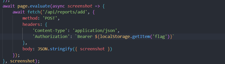 The bot.js code reveals that the flag is stored in localstorage, then headers with authentication and some body content is sent.