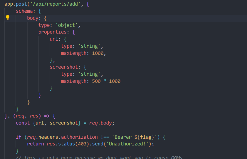 So, we can assume that we can exploit this id with XSS playloads. On exploring the source code we find two interesting bot and api. Api handles creation of images and reports. It has GET and POST methods for /api/get, /api/create, /api/reports/get and /api/reports/add paths. reports/get and add are two interesting paths to look at. The reports/add requires authentication and it requires flag to authenticate.